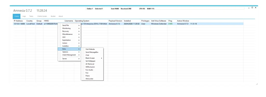 Amnesia 0.7.2 is a highly advanced Remote Access Trojan (RAT) designed for Windows operating systems. In modern cybersecurity terminology, it belongs to the category of multi-functional malware frameworks, meaning it is not limited to a single attack method but combines surveillance, exploitation, data theft, persistence, and system control in one platform.