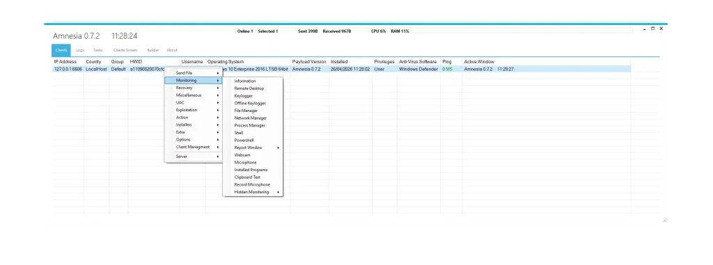 Unlike traditional malware, Amnesia 0.7.2 operates like a full cyber operations toolkit. It enables attackers to remotely control infected machines, steal sensitive information, bypass security systems, and maintain long-term access without detection.
