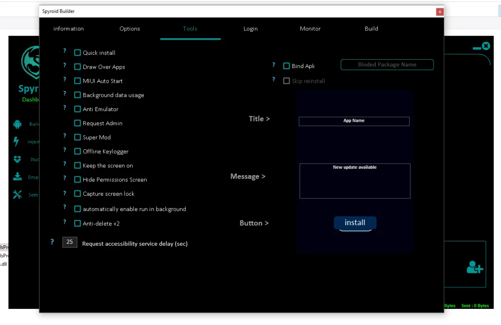 - Advanced Options: A dedicated tab offers checkboxes for features like Quick Install, Draw Over Apps, MIUI Auto Start, Background Data Usage, Anti-Emulator detection, Request Admin rights, Super Mod, Offline Keylogger, Keep Screen On, Hide Permissions Screen, Capture Screen Lock, Auto-Enable Run in Background, and Anti-Delete V2. There’s also a delay setting for accessibility service requests (e.g., 25 seconds).