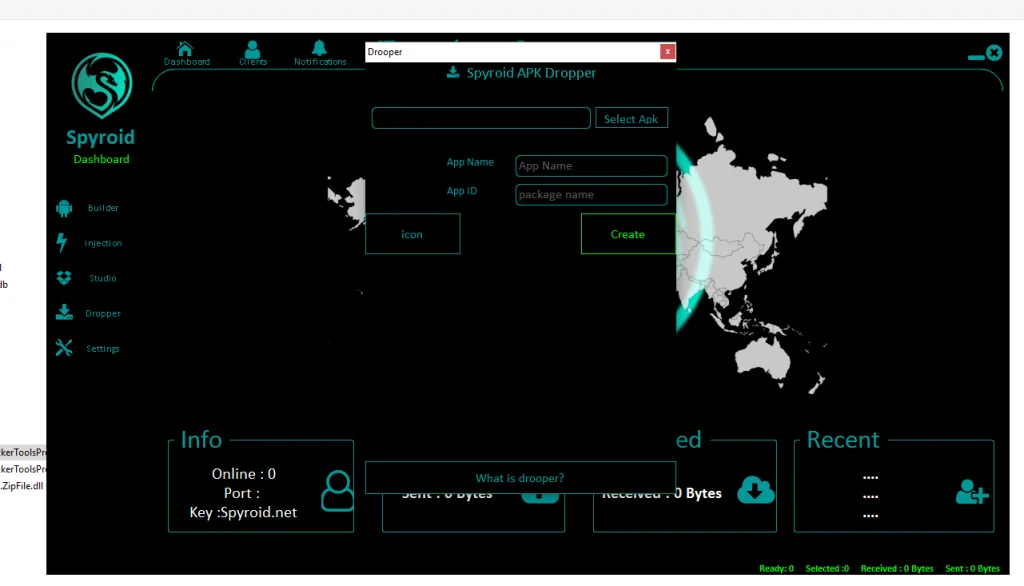 - Info Panel: Displays online status (e.g., 0 online), port, and key (e.g., Spyroid.net), with explanations like “What is dropper?” for user guidance.